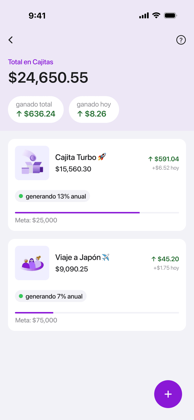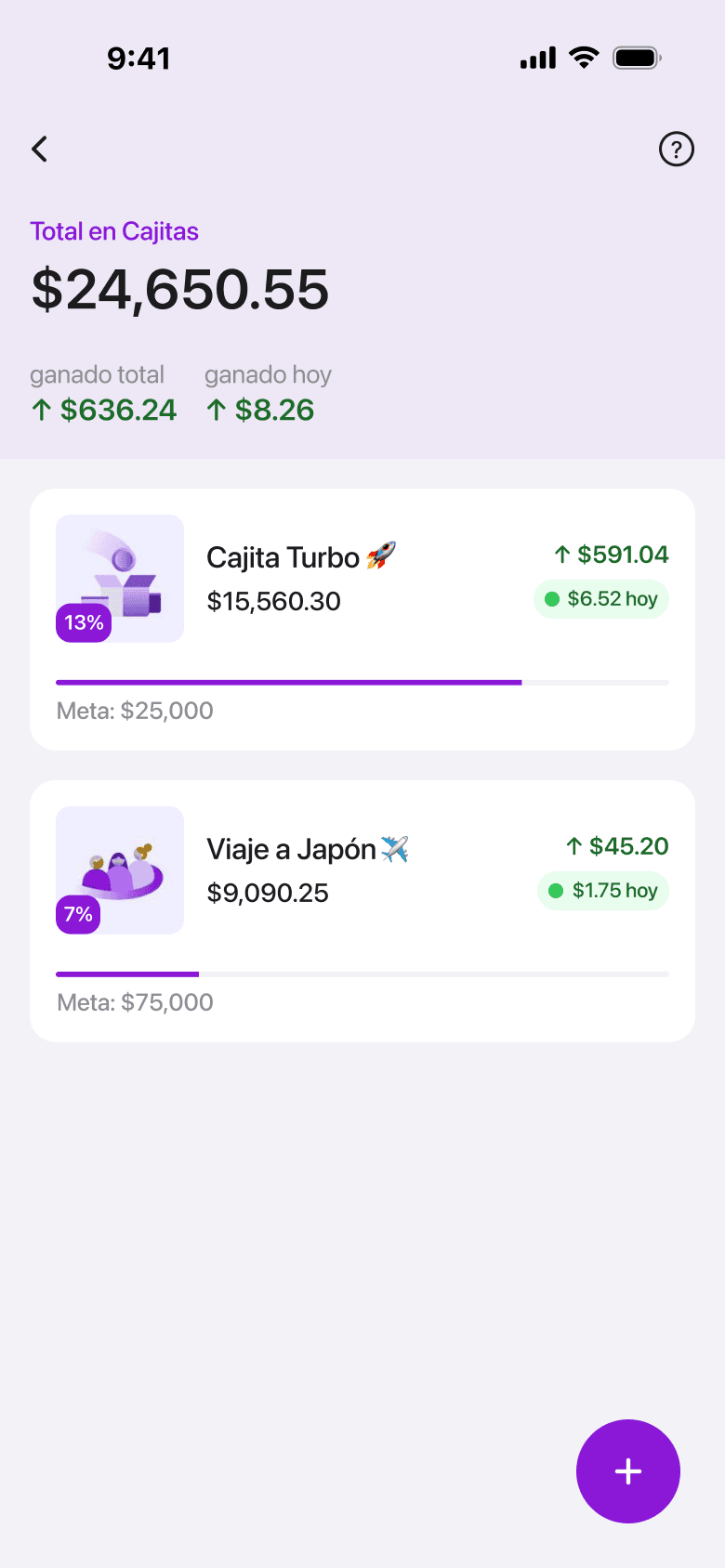 First version with goal progress per cajita. Answers "am I on track?" — but the rate stays hidden behind the icon badge.