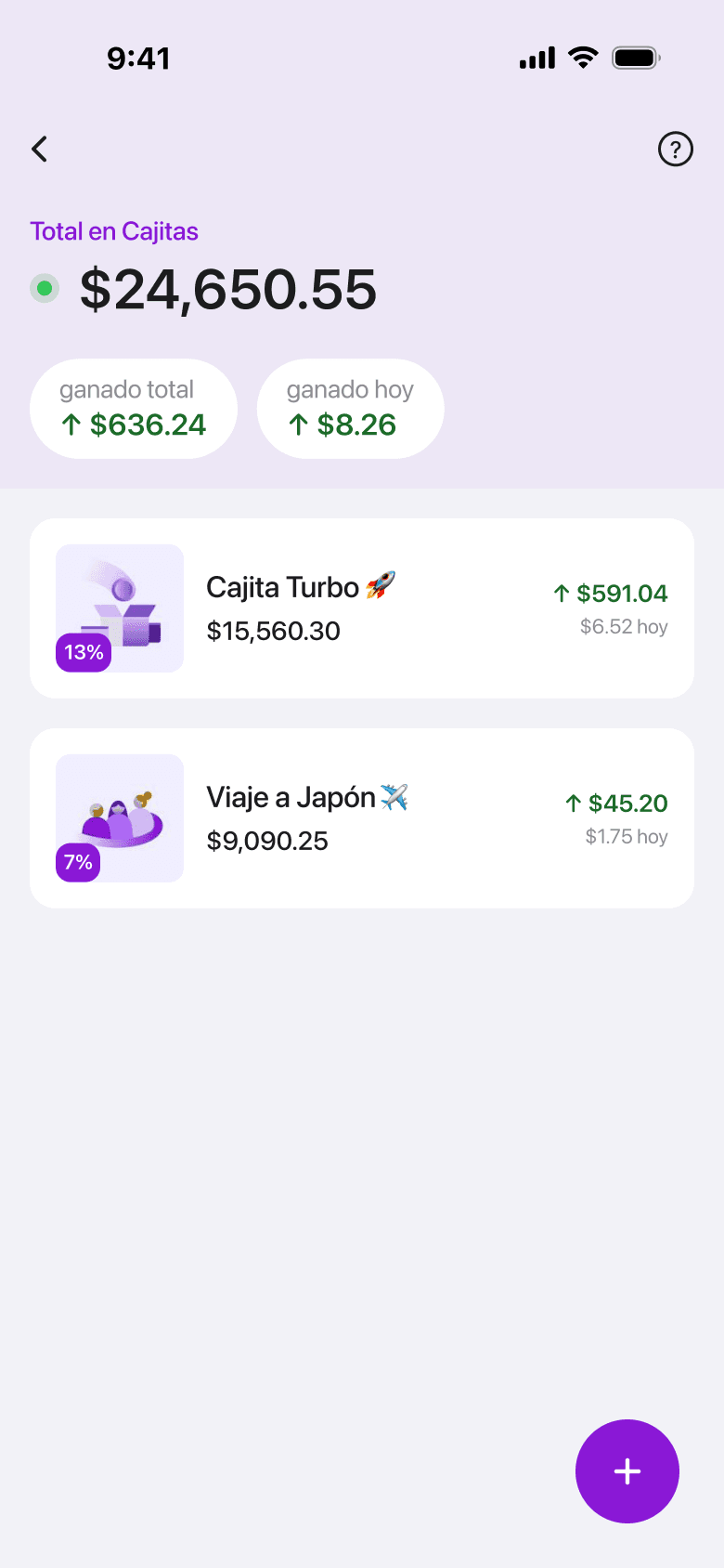 Two cajitas showing identical yield numbers. The growth label reads "Así ha crecido tu saldo en Cajitas" — but with no daily breakdown, and no goal progress, users have no reference point for what that number means or whether it's good.
