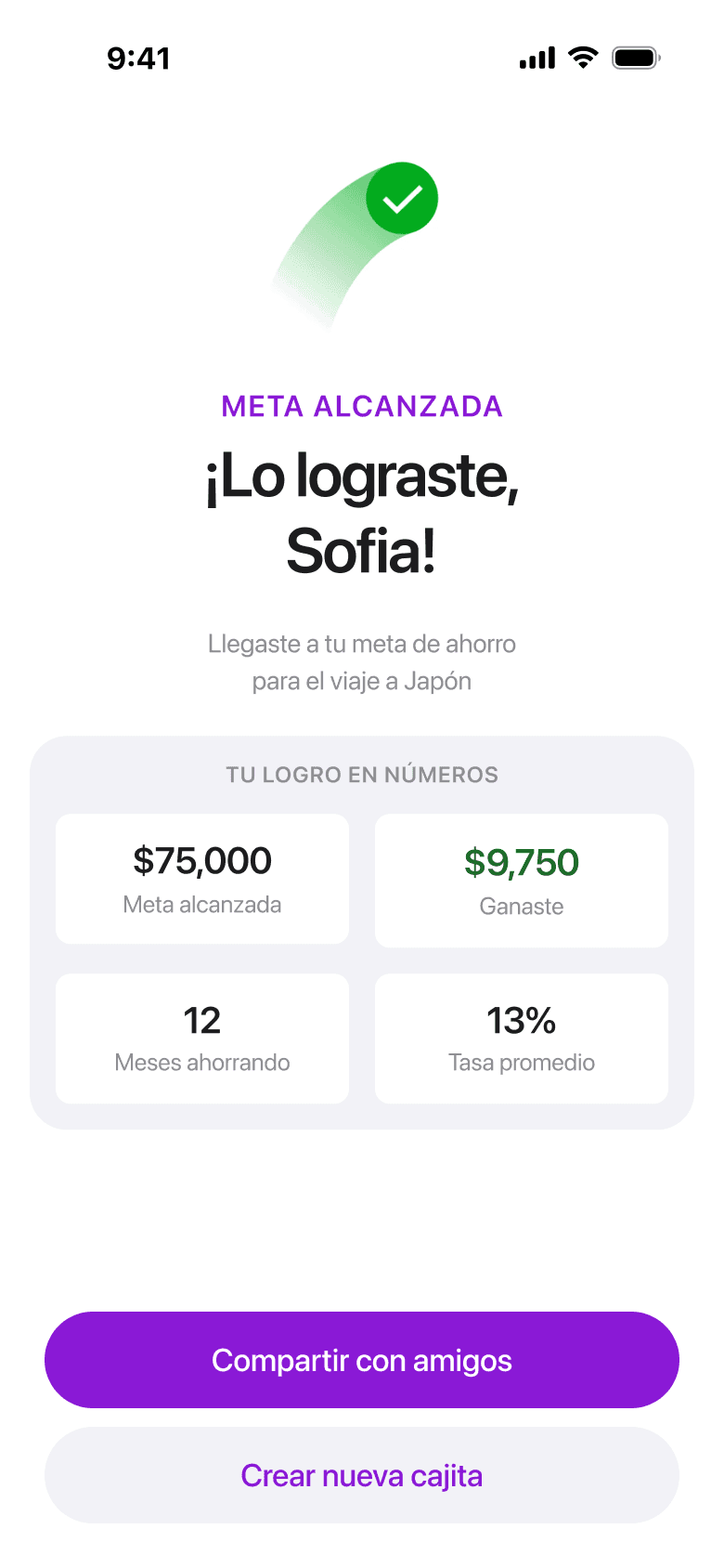 Reaching a savings goal is a significant moment that Nu currently ignores. The celebration screen gives users a shareable stats card with the numbers that matter — goal reached, yield earned, months saving. The Reddit screenshot moment now happens inside the app.