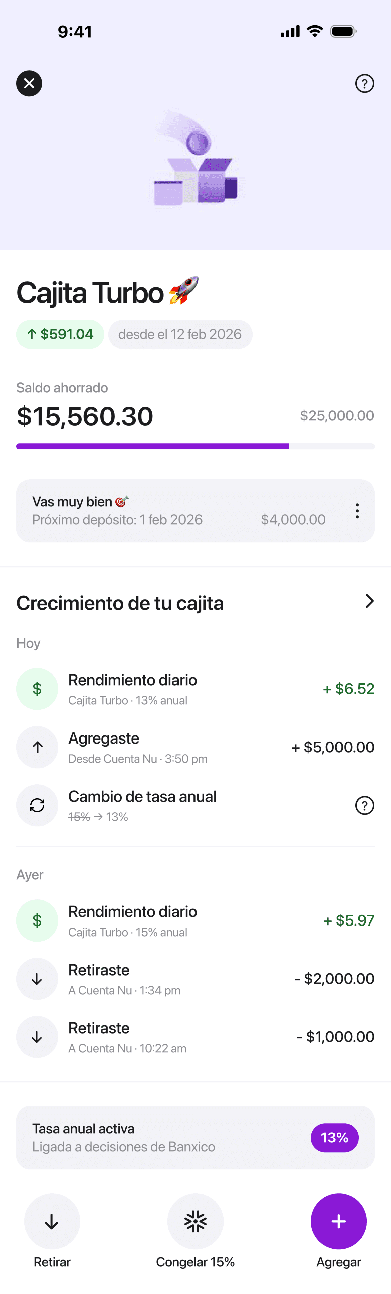 Cajitas is Nu's most differentiated product in the Mexican market. Unlike traditional savings accounts, it offers competitive annual yields (currently 13%) with no lock-in period. Users can create multiple cajitas for different goals, name them, and move money freely.